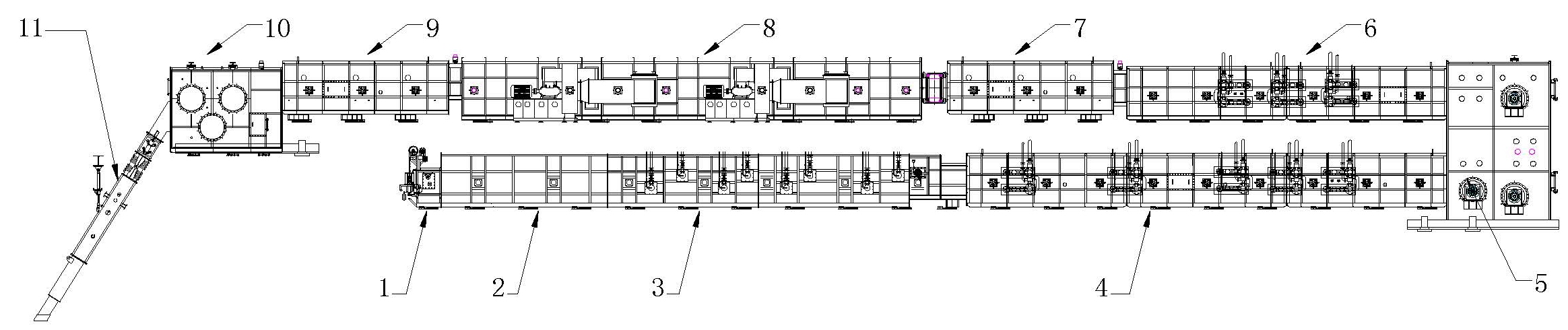 1.Entrance gas tight 2.Pr-heating section 3.Non-oxidant burning section 4.Bottom radiant tube heating section 5.Folding chamber 6.Bottom radiant tube heating section 7.Soaking section 8.Cooling section 9.Balance section 10.Heat chamber 11.Furnace nose